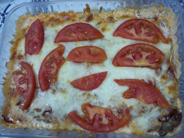 Coloquei 6 fatias de pá de porco assada a cobrir o fundo de um pirex(a receita original é feita com bife de peru grelhado) , por cima coloquei fatias de fiambre de frango, queijo mozarela ralado, um bocadinho de polpa de tomate, dois pacotes de natas de soja, temperei com alho em pó, pimenta moída e orégãos, coloquei fatias de tomate por cima e levei ao forno por 25 minutos!